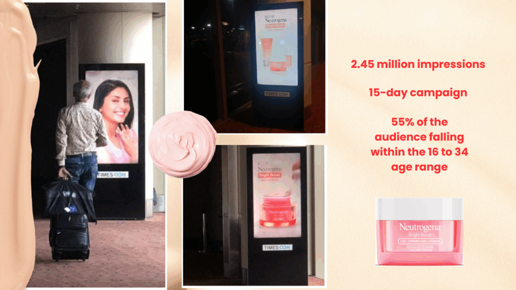 Neutrogena strategically utilized the Digital Out-of-Home (DOOH) screens in T2 Prime Passage at Mumbai Airport to amplify the launch of its new product. Leveraging the power of DV360, the brand activated a programmatic campaign across 38 physical screens strategically placed in high-dwell areas of the airport, ensuring maximum exposure to the target audience. Moving Audiences played a crucial role in planning the campaign by providing valuable insights on forecasted Reach, Potential Views, and Impressions data. This data not only guided the planning process but also served as a benchmark to measure the campaign’s actual performance and effectiveness.