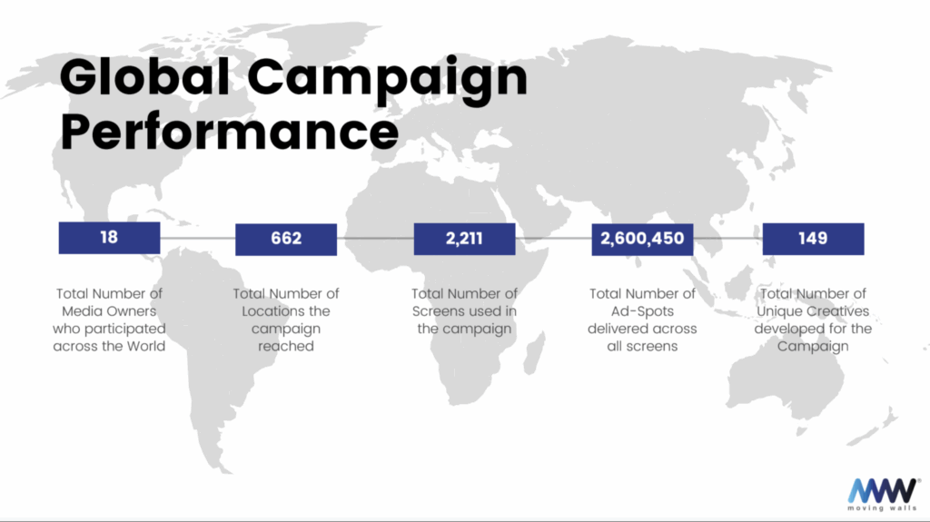 The campaign involved the participation of 18 media owners across the world who collectively deployed the campaign in an impressive 662 locations globally, utilizing 2,211 screens. The extensive reach and engagement efforts yielded outstanding results, with a total of 2,600,450 ad spots delivered across all screens. What’s more, the team developed a remarkable 149 unique creatives for the campaign, ensuring a diverse and captivating brand experience for the audience throughout the tournament. These real-time highlights were broadcasted on thousands of digital billboards across the world, driving visibility, creating awareness, and fostering interest in the sport.